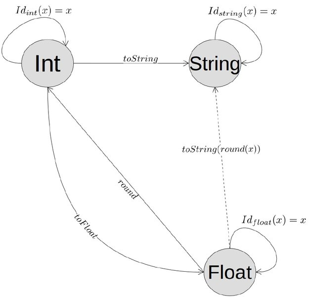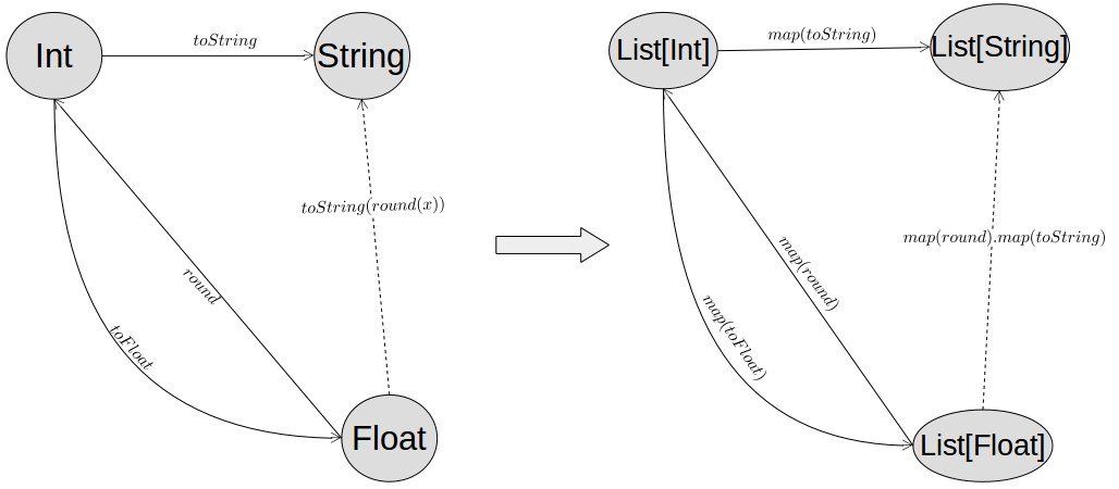 For example, we can transform the entire category above with a List functor. The relationships between all of the types goes from a function like toString to map(func) or map(toString). This also applies to toFloat, round, and any other functions in our category.